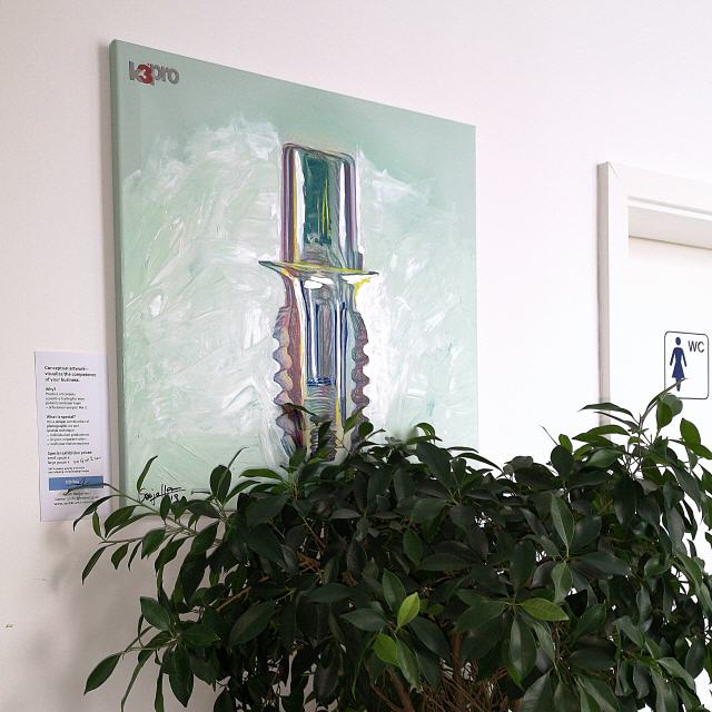 Die Künstlerin Sonja Maria Schneider-Henn setzt sich bei den individuell angefertigten Exponaten speziell mit den Themen der Unternehmen und Praxen, deren Produktionsprozessen und mit seinen Menschen auseinander.